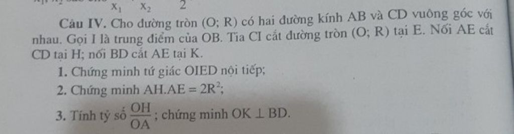 Ta cũng có : ∠IBK = ∠IEK = 45o ( vì cùng chắn cung 1/4 của (O)) ⇒ IBEK nội tiếp mà ∠BEK = 90o ( vì chắn đường kính BA) ⇒ ∠BIK = 90o ⇒ IK//OD mà I là trung điểm OB ⇒ K là trung điểm cạnh huyền BD của Δ vuông cân OBD ⇒ OK ⊥ BD