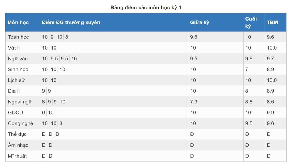 Bảng điểm các môn học kỳ 1