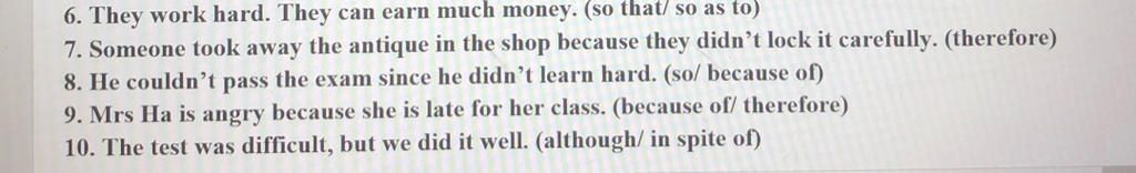 `9.` Mrs Ha is late for her class; therefore, she is angry.
