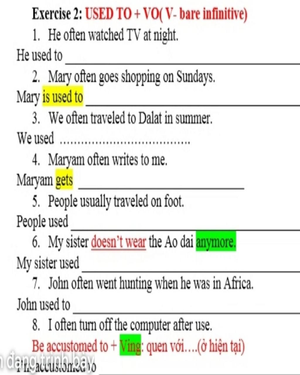 Be used to Ving ~ Get used to Ving ~ Be accustomed to Ving : quen với