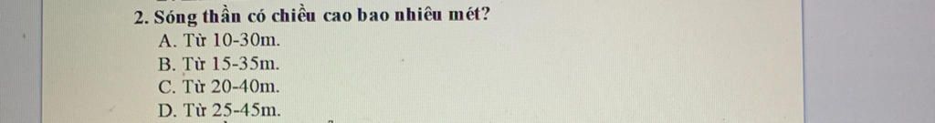 Giải thích : Nguyên nhân sóng thần là do động đất ngầm ở dưới đấy biển, sóng thần có thể cao đến khoảng `20 - 40 mét`