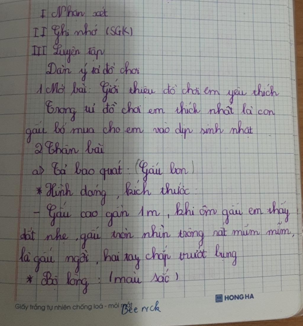 Hôm trước là bố tôi đi chơi.Vì vậy, tôi đã nhận được rất nhiều quà từ bố mẹ, anh chị và bạn bè,nhưng món đồ mà tôi thích nhất đó chính là con gấu bông.