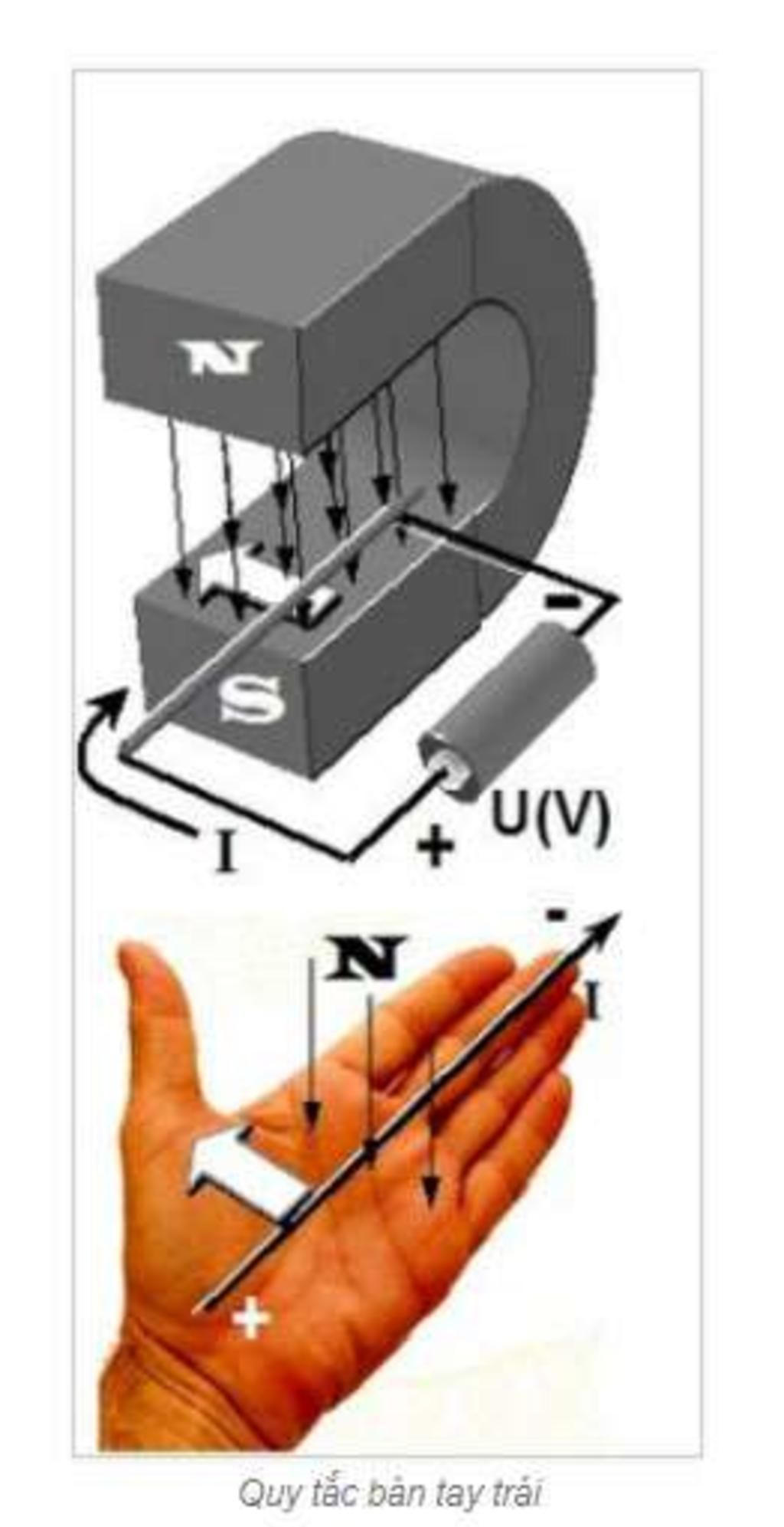 - `Quy` tắc bàn tay trái: Đặt bàn tay trái sao cho các đường sức từ hướng vào lòng bàn tay, chiều từ cổ tay đến ngón tay giữa hướng theo chiều dòng điện chạy qua dây dẫn. Khi đó, ngón tay cái choãi ra $90^o$chỉ chiều của lực điện từ tác dụng lên dây dẫn.