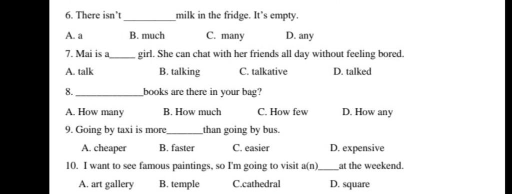 7.C talkative là một tính cách còn các đáp án khác thì ko phải