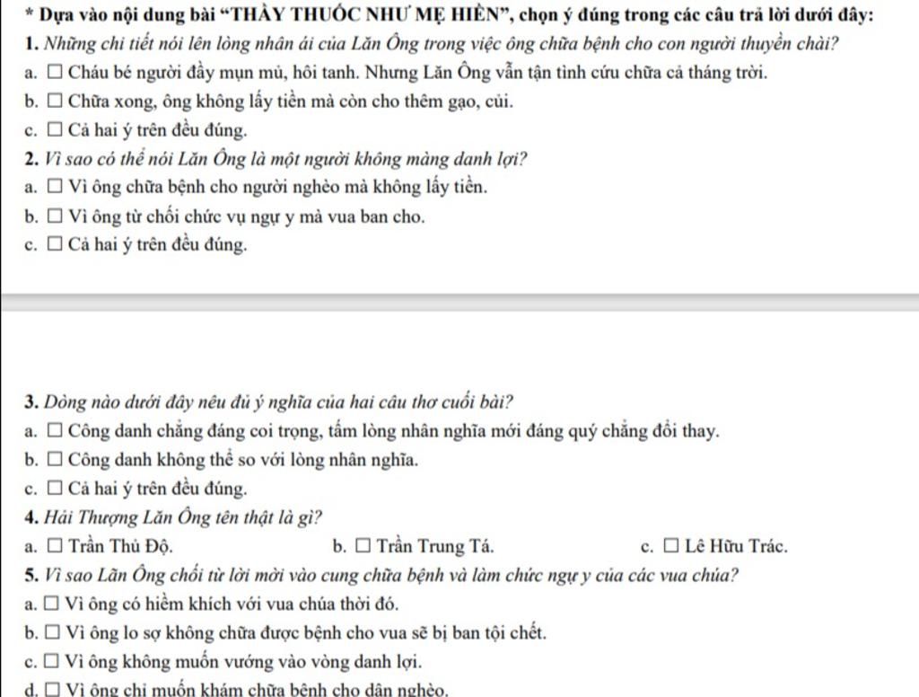 Dựa vào nội dung bài “THẦY THUỐC NHƯ MẸ HIỀN", chọn ý đúng trong các câu trả lời dưới đây: