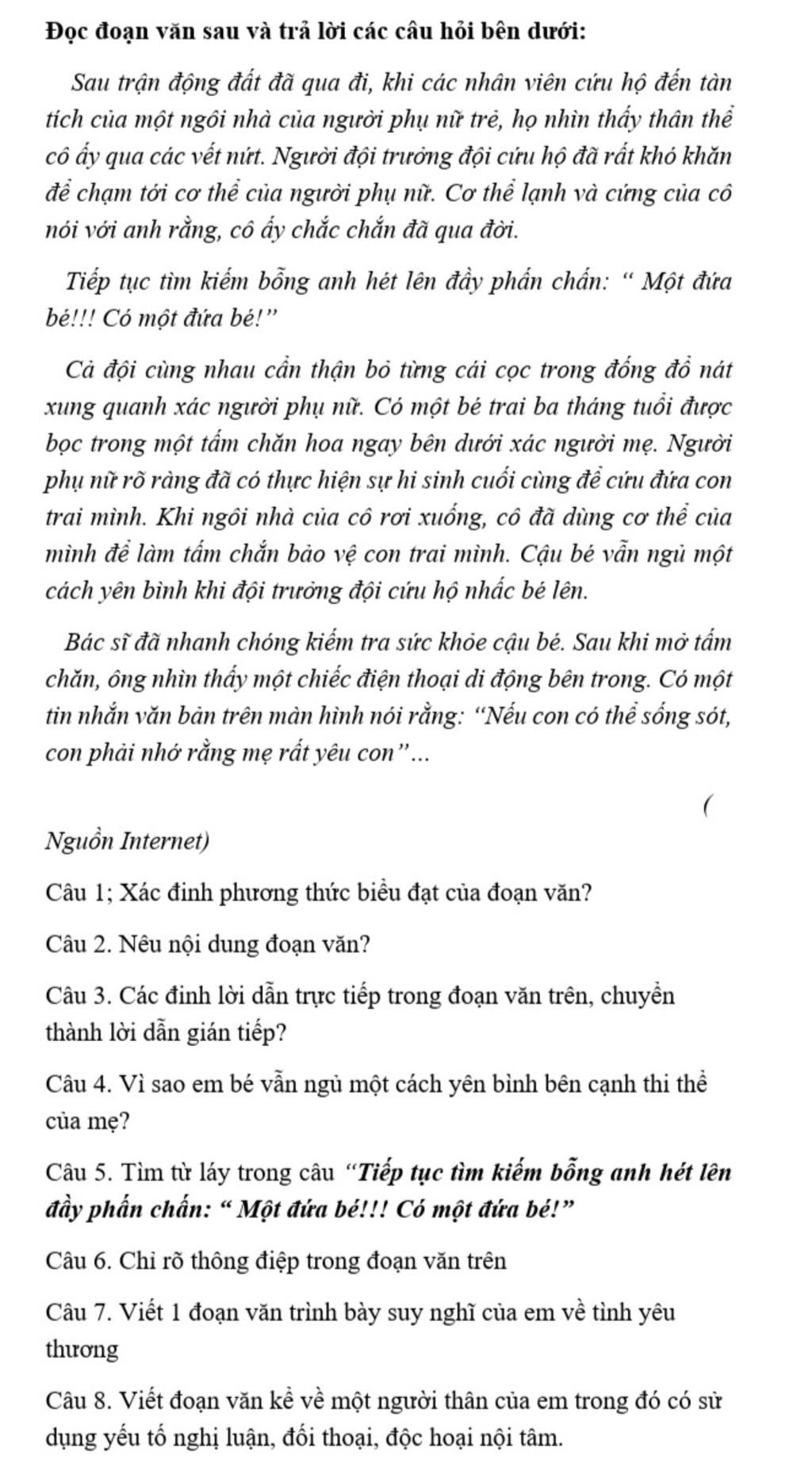 câu 7 Lòng yêu thương là sự đồng cảm, chia sẻ, gắn bó, thấu hiểu giữa con người với con người. Đó là một trong những phẩm chất cao đẹp của con người. Lòng yêu thương có sự biểu hiện rất đa dạng và phong phú trong cuộc sống. Chẳng hạn như đó có thể là sự cảm thương, quan tâm, giúp đỡ những người có cảnh ngộ bất hạnh, khó khăn trong cuộc sống; hoặc yêu mến và trân trọng những người có phẩm chất, tình cảm cao đẹp. Trong cuộc sống của chúng ta, lòng yêu thương có một ý nghĩa vô cũng quan trọng vì nó làm cho mối quan hệ giữa người với người trở nên tốt đẹp. Cuộc sống vì thế mà cũng trở nên thân thiện, ấm áp, vui vẻ và hạnh phúc hơn. Ví dụ như trong một gia đình, nếu mọi thành viên thật sự yêu thương, quan tâm, chăm sóc và chia sẻ với nhau mọi khó khăn trong cuộc sống thì chắc chắn sẽ tạo dựng được một không khí gia đình đầm ấm và hạnh phúc. Lòng yêu thương không phân biệt màu da, ngôn ngữ, khoảng cách giàu nghèo sẽ tạo điều kiện làm cho mọi người xích lại gần nhau hơn. Ngoài ra, nhờ lòng yêu thương, mọi người sẽ cùng nhau đoàn kết tạo nên sức mạnh vật chất và tinh thần để động viên nhau cùng nhau vượt qua gian khổ, thử thách, xóa tan những hận thù và cảm hóa được cả những con người lầm lỗi. Nhờ có lòng yêu thương, sự trợ giúp lẫn nhau mà những tai họa do con người hay thiên nhiên gây ra mau chóng được khắc phục, những mảnh đời bất hạnh tìm thấy niềm vui sống, những con người có ước mơ, hoài bão lớn nhưng không có điều kiện thực hiện đã nhanh chóng đạt được điều mình ao ước… Bên cạnh đó, khi chúng ta biết sống yêu thương người khác và nhận được tình yêu thương thì tâm hồn chúng ta sẽ được bồi đắp trở nên trong sáng, cao đẹp hơn. Niềm tin vào con người và cuộc sống vì thế mà sẽ được củng cố, vun vén. Với những ý nghĩa trên, lòng yêu thương cần phải được nhân rộng và trân quý, ca ngợi trong cuộc sống hôm nay. Mỗi chúng ta cần phải sống có lòng yêu thương với tất cả mọi người, sẵn sàng chia sẻ, cảm thông, giúp đỡ người khác. Song song đó, chúng ta cũng cần phải lên án lối sống thiếu tình yêu thương, ích kỉ, vô cảm trước nỗi đau của đồng loại, và thẳng thắn phê phán những kẻ lợi dụng tình thương để thể hiện những ý đồ đen tối, để tự đánh bóng tên tuổi mình. câu 8