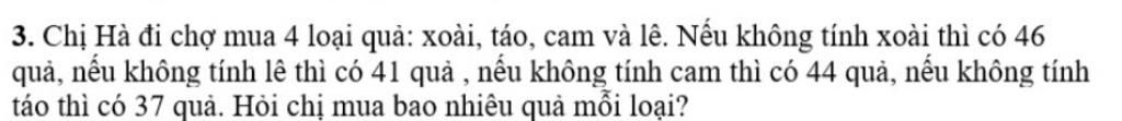 $\text{Đáp số: 10 quả xoài, 15 quả lê, 12 quả cam và 19 quả táo.}$