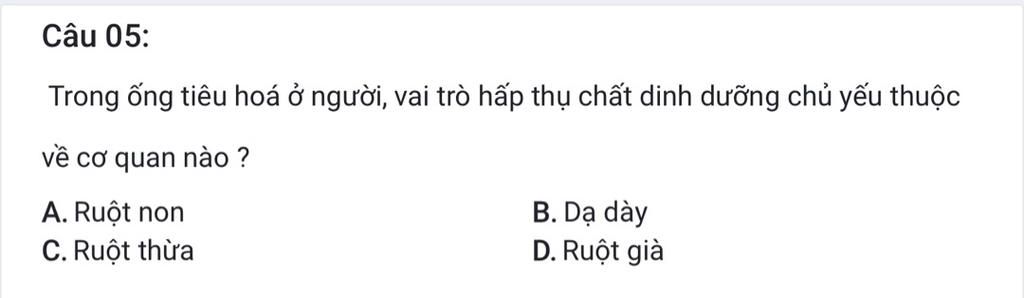 A,ruột non(ruột non có các lông cực nhỏ để có thể hấp thụ chất dinh dưỡng tốt hơn)