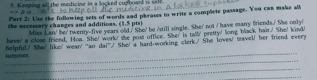 Miss Lan is twenty-five years old. She is still single. She doesn't have many friends. She only has a close friend, Hoa. She works in the post office. She is tall and pretty with long black hair. She is kind and helpful. She likes wear ''ao dai''. She is a hard-working clerk. She loves travel with her friend evey summer.