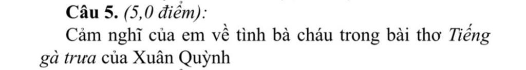 Tình thân, tình cảm gia đình luôn là nguồn cảm hứng vô tận cho các nhà thơ, nhà văn sáng tạo. Ta không khỏi ngậm ngùi, xúc động trước tình cảm cha con của ông Sáu trong Chiếc lược ngà của Nguyễn Quang Sáng. Tình mẫu tử thiết tha, thiêng liêng quý báu trong bài thơ Mẹ ốm của Trần Đăng Khoa hay trong tác phẩm Trong lòng mẹ của Nguyên Hồng. Đến với thơ Xuân Quỳnh, ta bắt gặp tình cảm bà cháu ấm áp yêu thương dành cho nhau qua bài Tiếng gà trưa, bài thơ giản dị mà sâu sắc được trích trong tập "Hoa dọc chiến hào" viết vào những năm kháng chiến chống Mỹ oanh liệt.