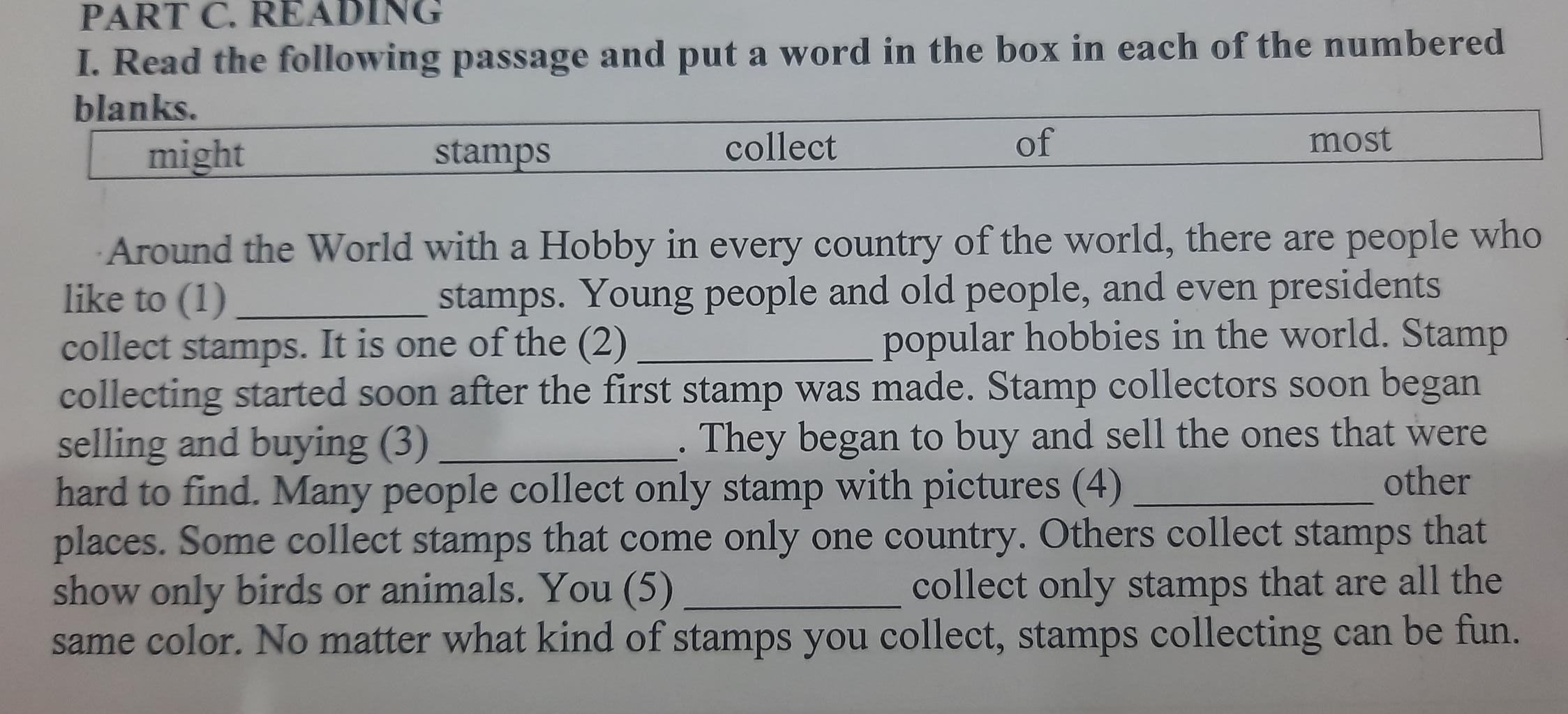 Around the World with a Hobby in every country of the world, there are people who like to (1)of collect stamps. It is one of the (2)might collecting started soon after the first stamp was made. Stamp collectors soon began selling and buying (3)most hard to find. Many people collect only stamp with pictures (4)collect places. Some collect stamps that come only one country. Others collect stamps that show only birds or animals. You (5)stamps same color. No matter what kind of stamps you collect, stamps collecting can be fun. stamps. Young people and old people, and even presidents popular hobbies in the world. Stamp They began to buy and sell the ones that were other collect only stamps that are all the ik