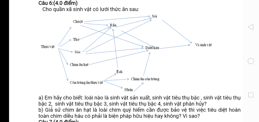 b) Việc tiêu diệt hoàn toàn chim diều hâu để bảo vệ chim ăn hạt là loài chim quý hiểm không phải là biện pháp hữu hiệu. Vì