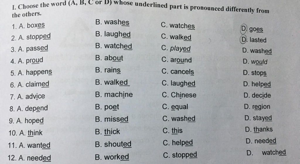 I. Choose the word (A, B, C or D) whose underlined part is pronounced differently from