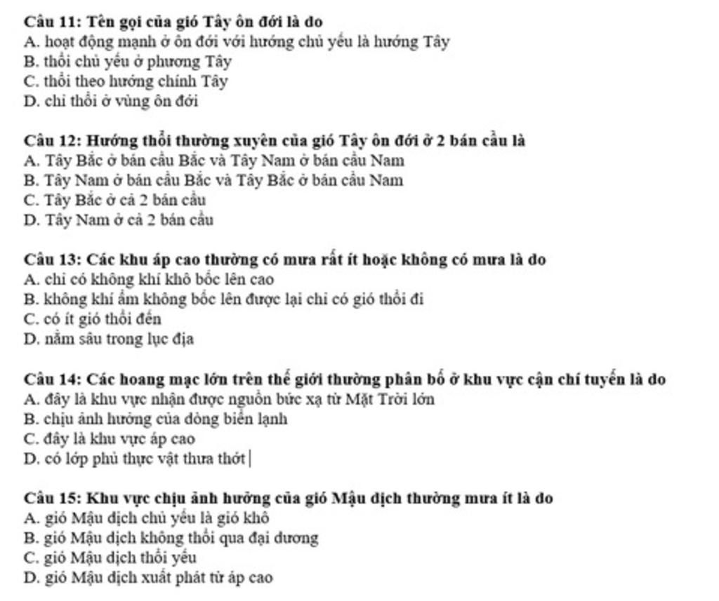 Câu 21. Gió Mậu dịch ở nửa cầu Bắc thổi theo hướng