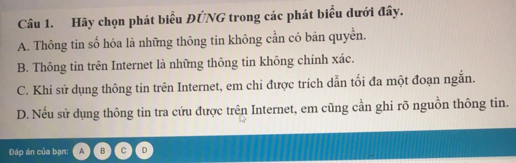 D. Nếu sử dụng thông tin tra cứu được trên Internet, em cũng cần ghi rõ nguồn thông tin.