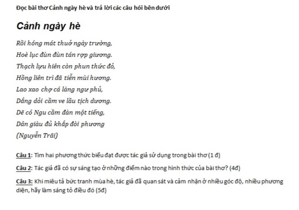 Đọc bài thơ Cảnh ngày hè và trả lời các câu hói bên dưới