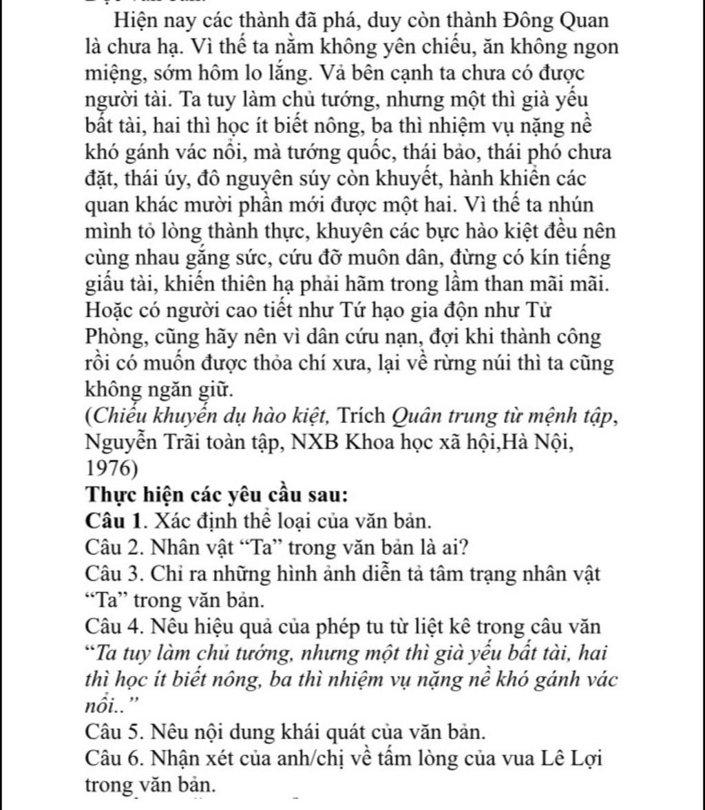 `-`Nêu nội dung khái quát của văn bản: Niềm boăn khoăn, lo lắng của vua Lê Lợi khi giặc xâm phạm bờ cõi.