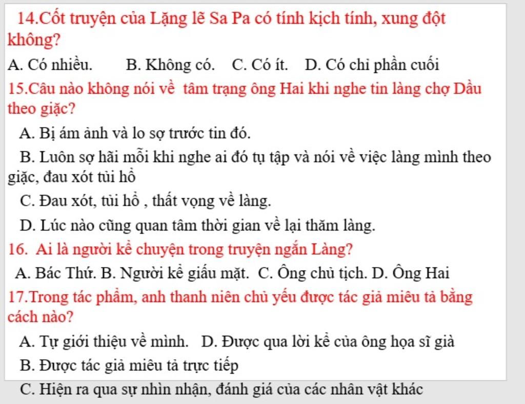 16. Ngôi kể trong truyện ngắn Làng là ngôi thứ ba (người kể giấu mặt)
