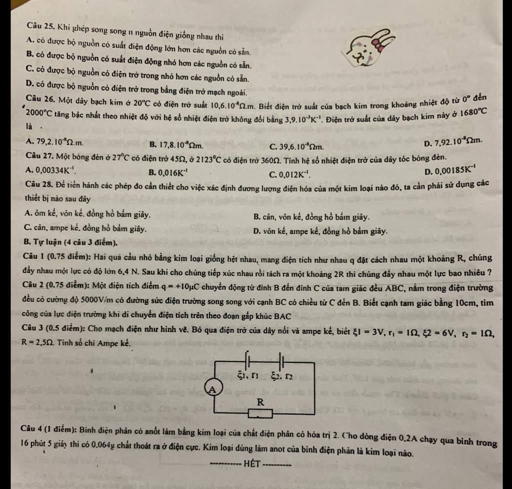 Câu 26. Một dảy bạch kim ở 20°C có điện trở suất 10,6.10*2.m. Biết điện trở suất của bạch kim trong khoảng nhiệt độ từ 0° đến