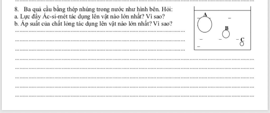 a. Lực đẩy Ác-si-mét tác dụng lên vật A lớn nhất