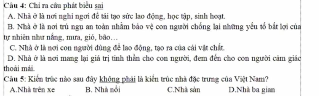 -> chọn `C` : Nhà là nơi con người dùng để lao động , tạo ra của cải vật chất ( sai )
