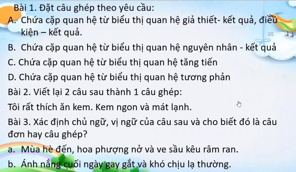 `2.` Tôi rất thích ăn kem vì kem rất ngon và mát lạnh. (QHT `:` vì)