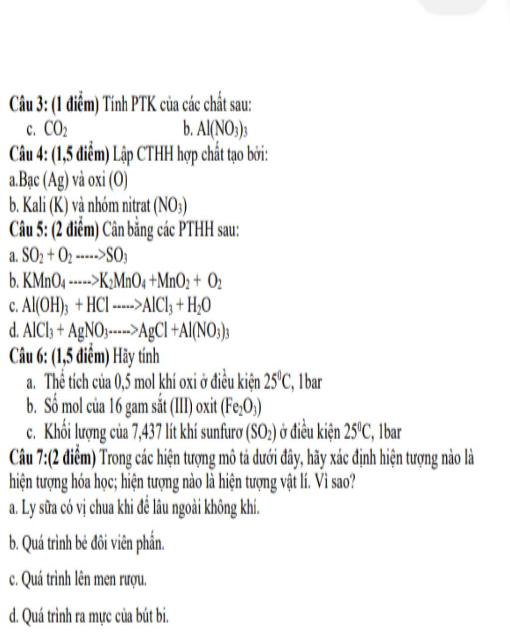 Câu 3: (1 điểm) Tính PTK của các chất sau: