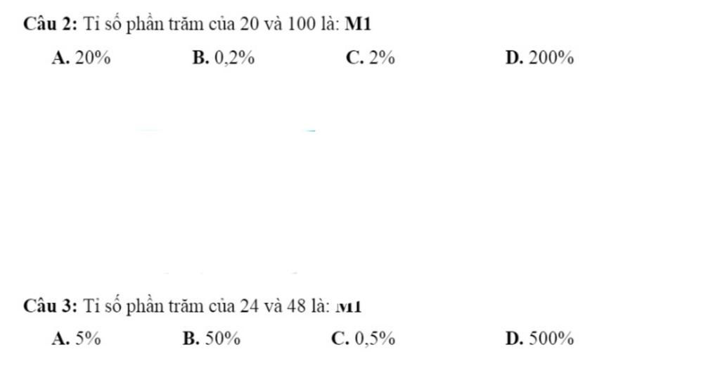 Câu 2: Tỉ số phần trăm của 20 và 100 là: