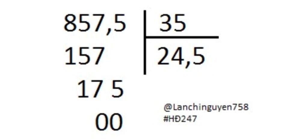 - Hạ `5` được `175`, viết `175` ; `175` chia `35` được `5`; `5` nhân `35` bằng `175`; `175` trừ `175` bằng `0`, viết `0` .