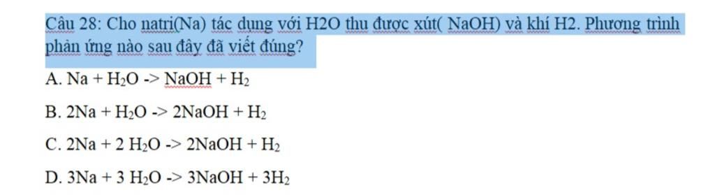 Câu 28: Cho natri(Na) tác dụng với H2O thu được xút( NaOH) và khí H2. Phương trình