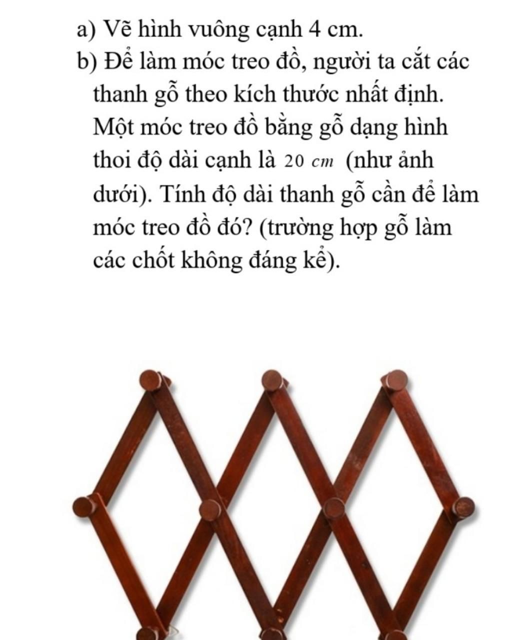 b)Quan sát hình vẽ, ta thấy độ dài thanh gỗ để làm móc treo bằng 3 lần chu vi hình thoi có cạnh là $20cm$
