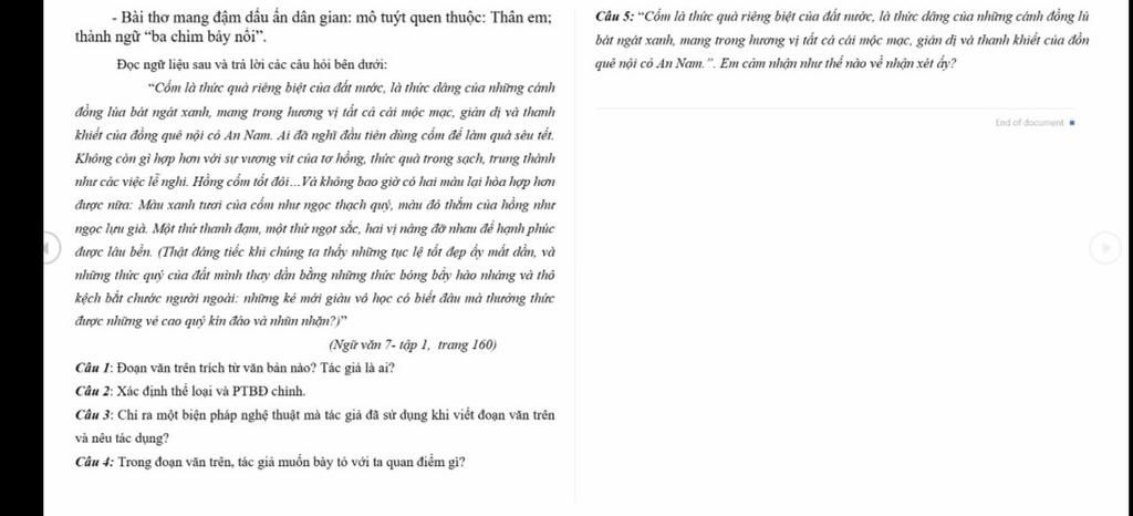 Câu 5: “Cổm là thức quà riêng biệt của đất nước, là thức dãng của những cánh đồng lủ