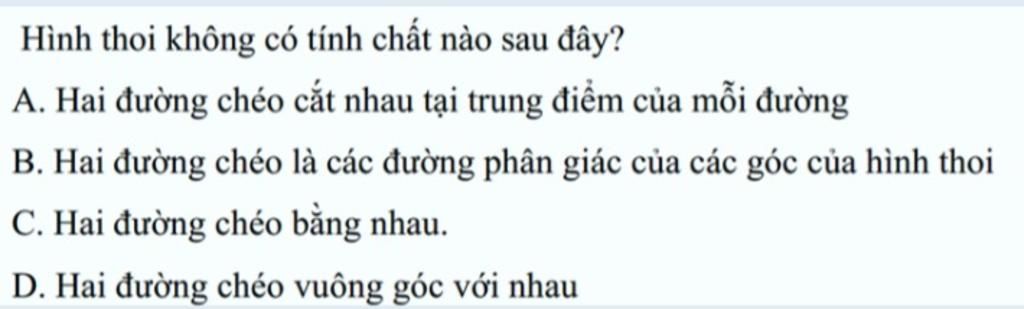 ` C. ` Hai đường chéo của hình chữ nhật mới bằng nhau, nếu hình thoi có hai đường chéo bằng nhau thì nó thành trường hợp đặc biệt là hình vuông .