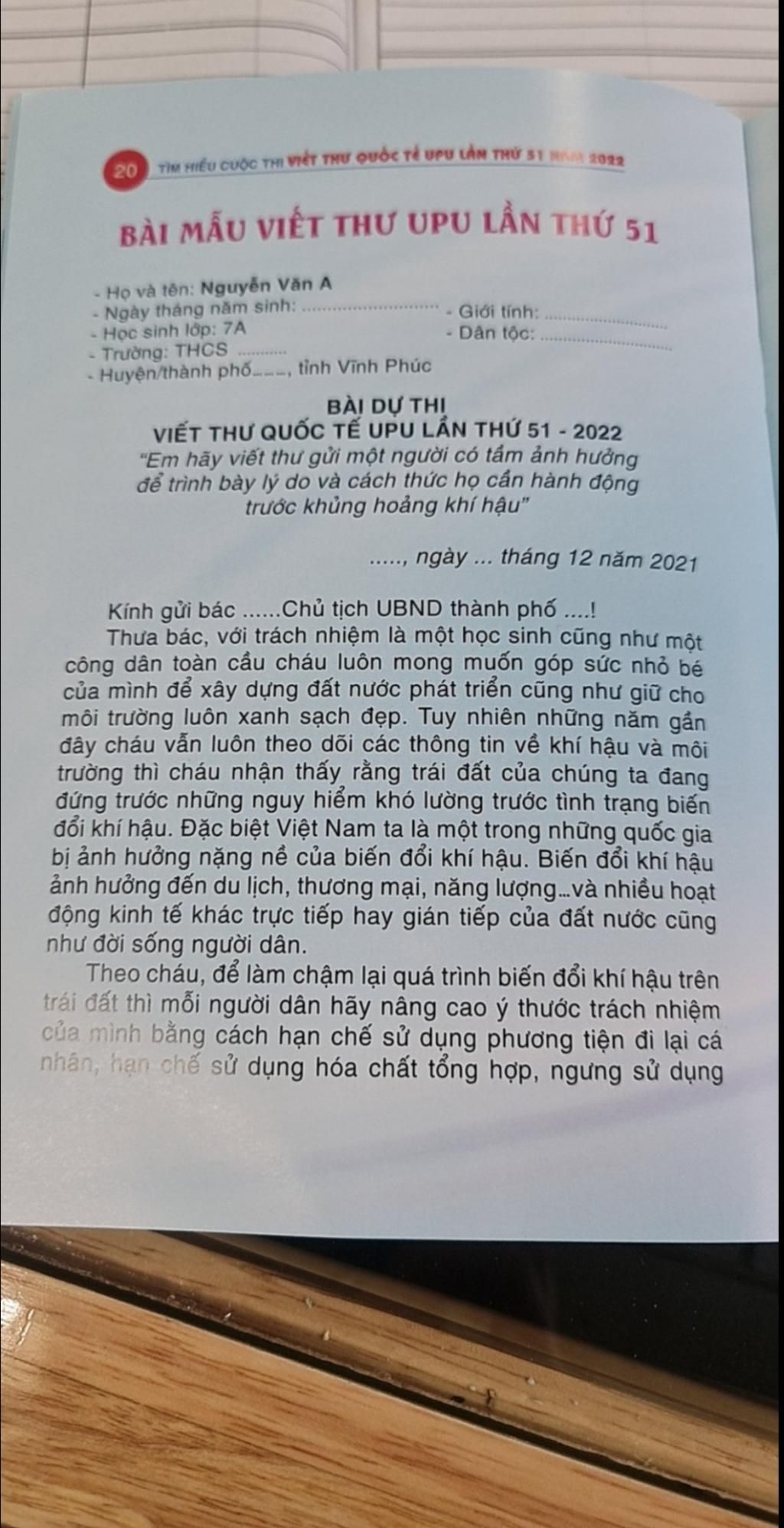 BÀI MẪU VIẾT THƯ UPU LẦN THỨ 51