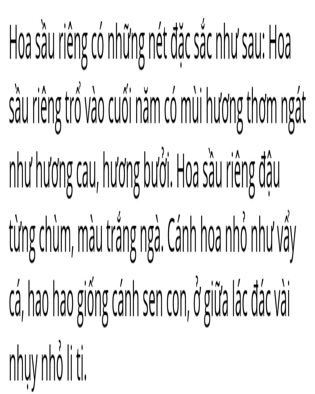 Hoa sầu riêng có những nét đặc sắc như sau: Hoa sầu riêng trổ vào cuối năm có mùi hương thơm ngát như hương cau, hương bưởi. Hoa sầu riêng đậu từng chùm, màu trắng ngà. Cánh hoa nhỏ như vẩy cá, hao hao giống cánh sen con, ở giữa lác đác vài nhụy nhỏ li ti.