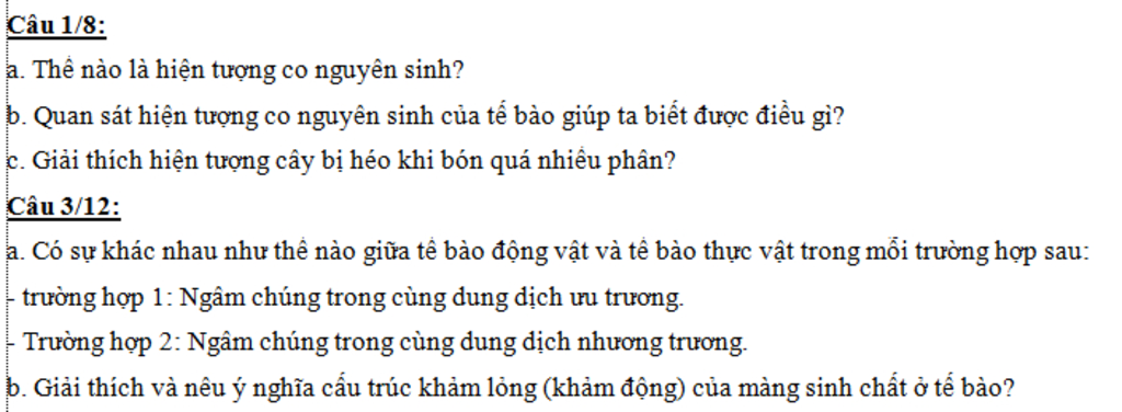 a/ Hiện tượng co nguyên sinh là một quá trình diễn ra trong môi trường ưu trương, trong đó tế bào chất bị co rút lại thông qua quá trình thẩm thấu.