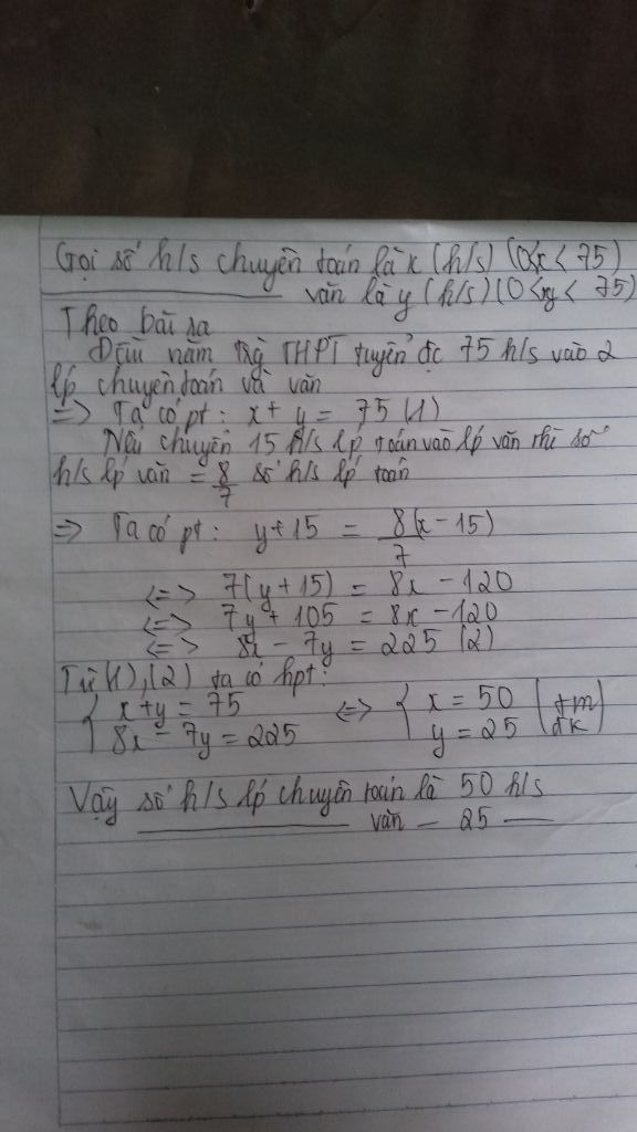 Vậy lớp Toán có 50 học sinh, lớp Văn có 25 học sinh.