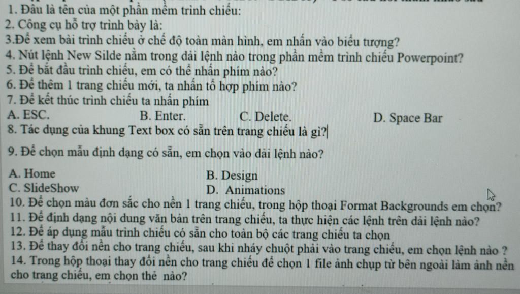 11, Để định dạng nội dung văn bản trên trang chiếu, ta thực hiện các lệnh trên dải lệnh: