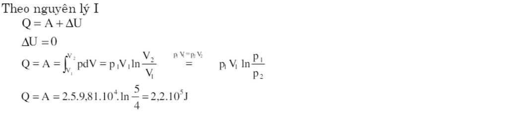 \(A = {p_1}{V_1}\ln \dfrac{{{p_1}}}{{{p_2}}} = \dfrac{{5.1,{{013.10}^5}}}{{1,033}}.2.\ln \dfrac{5}{4} = 2,{2.10^5}J\)