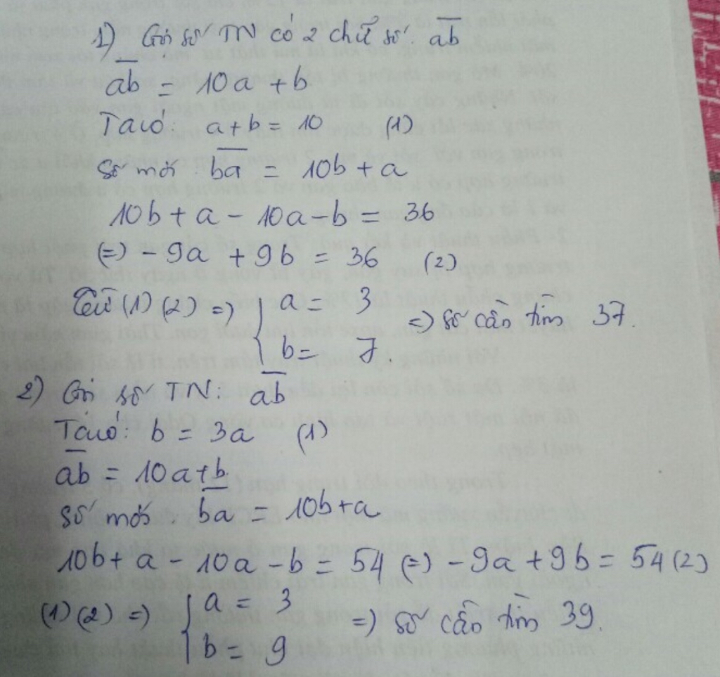 Bài 1: Gọi số tự nhiên có 2 chữ số cần tìm là: ab (0<a,b≤9) Theo bài, ta có phương trình: ba - ab=36 a + b = 10 Theo bài ta ta có PT: ba - ab = 36 ⇔ (10b + a) - (10a + b) = 36 ⇔ 10b + a - 10a - b = 36 ⇔ ( -10a - a) + (10b - b) = 36 ⇔ -9a + 9b = 36 ⇔ 9b - 9a = 36 ⇔ 9(b + a) - 18a = 36 ⇔ 9.10 - 18a = 36 ( vì a + b = 10) ⇔ 90 - 18a = 36 ⇔ -18a = 36 - 90 ⇔ -18a = -54 ⇔ a = 3 (TM) --> Chữ số hàng chục của số đó là: 3 --> Chữ số hàng đơn vị của số đó là: 10 - 3 = 7 Vậy số cần tìm là: 37 Rút gọnBài 1: Gọi số tự nhiên có 2 chữ số cần tìm là: ab (0<a,b≤9) Theo bài, ta có phương trình: ba - ab=36 a + b = 10 Theo bài ta ta có PT: ba - ab = 36 ⇔ (10b + a) - (10a + b) = 36 ⇔ 10b + a - 10a - b = 36 ⇔ ( -10a - a) + (10b - b) = 36 ⇔ -9a + 9b = 36 ⇔... xem thêm