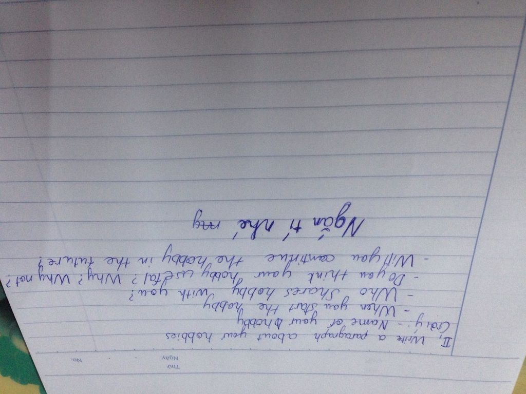 My hobby is playing the guitar. I often share my hobby with my sister or friends. I alway play the guitar in my free time after a stressful day. I started this hobby 2 years ago anf think it is useful. I will continue my hobby because it help me rest my mind and show off myself.