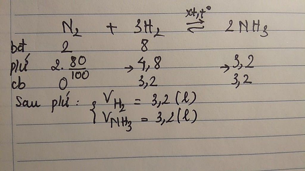 Đáp án: V của N2, H2, NH3 lần lượt là 0,4; 3,2; 3,2 lít.
