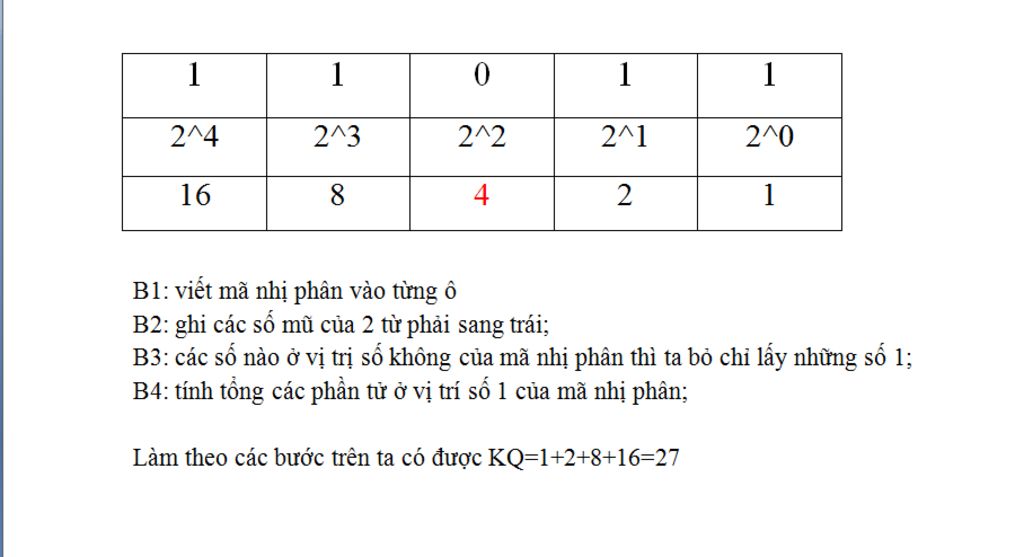 Dãy nhị phân 11011 biểu diễn số nào trong hệ thập phân sau: