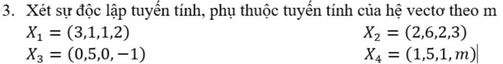 Hệ vector độc lập tuyến tính khi và chỉ khi $\det A \ne 0\Leftrightarrow -20m + 22 \ne 0 \Leftrightarrow m \ne \dfrac{11}{5}$