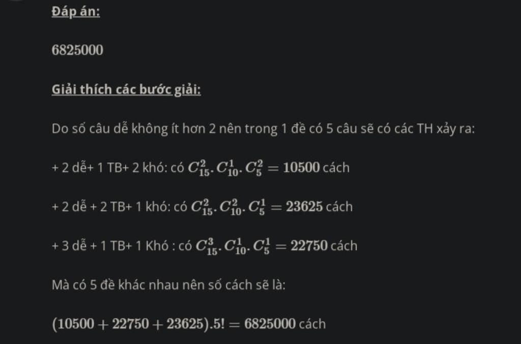 Trong 1 môn học, thầy giáo có 30 câu hỏi khác nhau gồm 5 câu khó, 10 câu trung bình, 15 câu dễ. Từ 30 câu hỏi đó có thể lập được bao nhiêu đề kiểm tra, mỗi đề gồm 5 câu khác nhau, sao cho trong mỗi đề nhất thiết phải có đủ 3 loại câu hỏi và số câu hỏi dễ không ít hơn 2