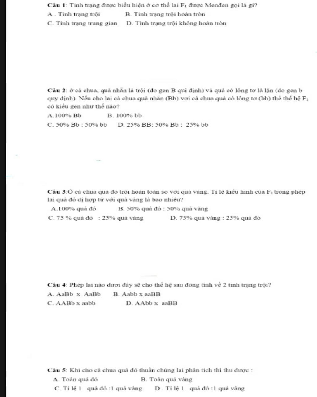 Câu `5:` Khi cho cà chua quả đỏ thuần chủng lai phân tích thì thu được?