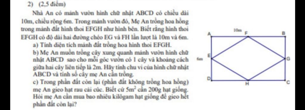 EFGH có độ dài hai đưởng chéo EG và FH lần lượt là 10m và 6m.