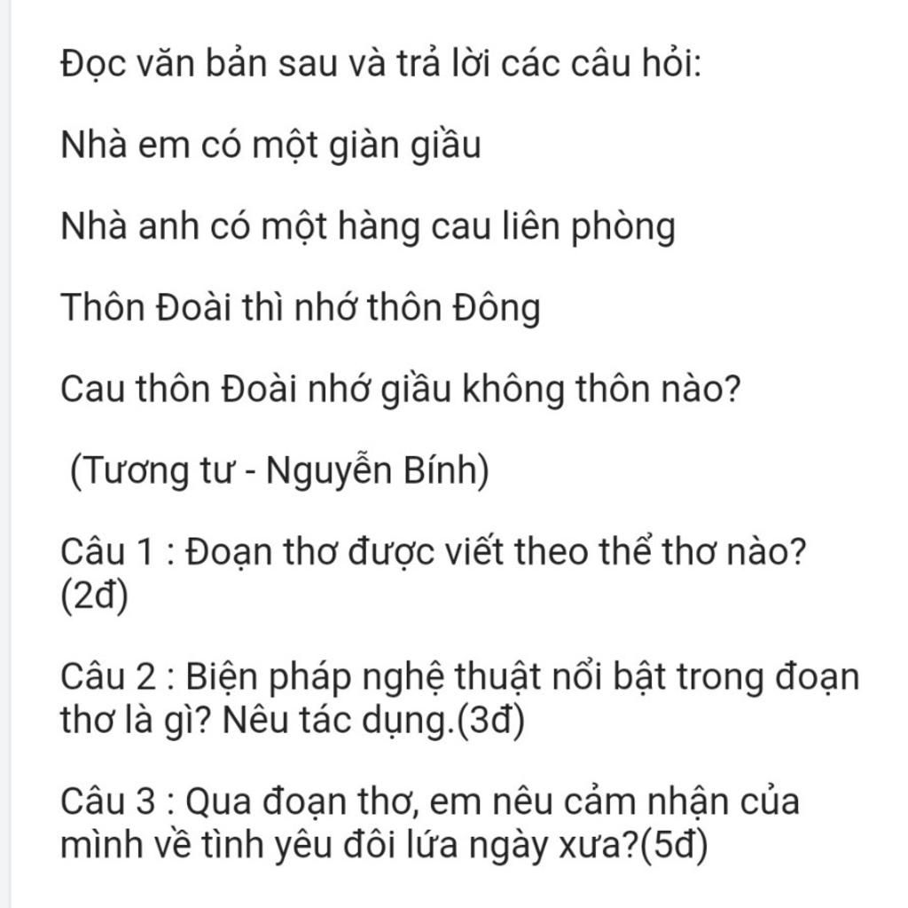 1: Đoạn thơ được viết theo thể thơ lục bát ( câu trên 6 câu dưới 8 )