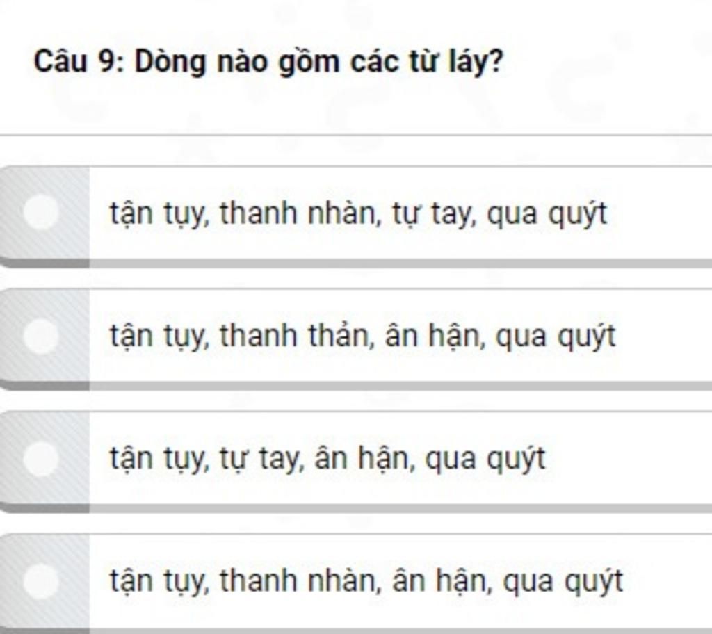 => chọn B tận tụy , thanh thản , ân hận , qua quýt