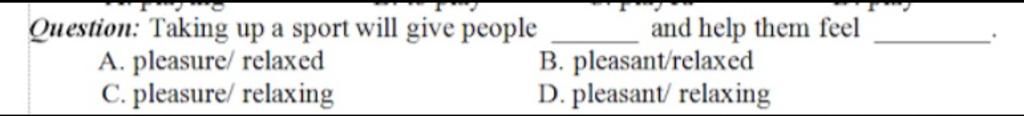 -> Chọn A. pleasure / relaxed